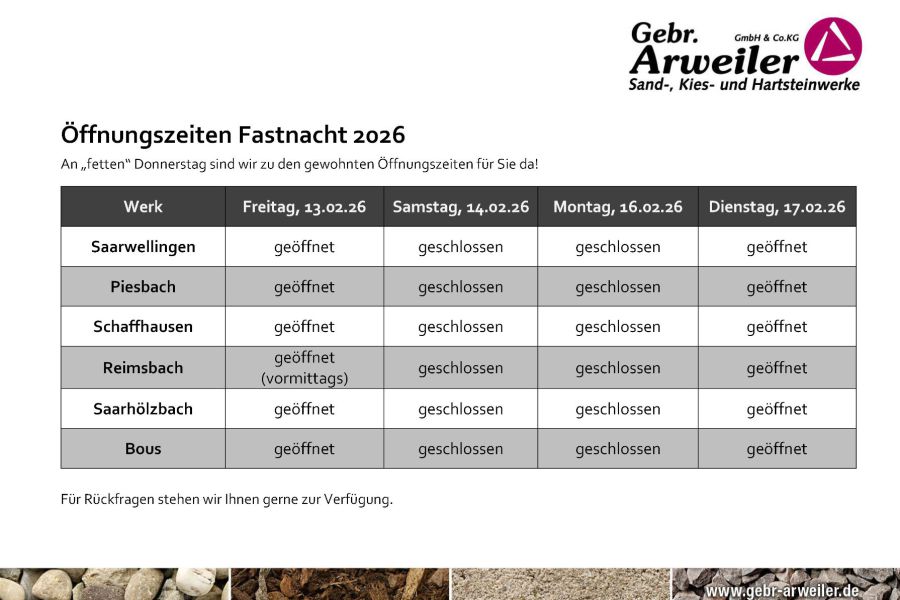 Abnehmer der rund 400 Arweiler-Produkte (über 20 Millionen Euro Jahresumsatz) sind die Betonindustrie, der Straßenbau, die Hüttenindustrie, der Wasserstraßen- sowie der Garten- und Landschaftsbau – aber auch der private Wohnungsbau. Umweltschutz schreibt Arweiler groß: Die Branche stehe wegen der Eingriffe in die Natur immer wieder mal in der Kritik. Daher sei Rekultivierung der abgebauten Flächen wichtig. Sand, Kies und Hartstein aber werden für die Bauwirtschaft gebraucht und sind nicht ersetzbar. „Jeder Mensch verbraucht im Laufe seines Lebens etwa 700 t Sand, Kies und Naturstein", so Altmeyer.