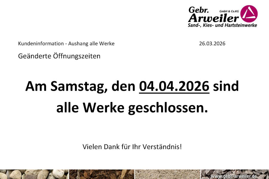 Abnehmer der rund 400 Arweiler-Produkte (über 20 Millionen Euro Jahresumsatz) sind die Betonindustrie, der Straßenbau, die Hüttenindustrie, der Wasserstraßen- sowie der Garten- und Landschaftsbau – aber auch der private Wohnungsbau. Umweltschutz schreibt Arweiler groß: Die Branche stehe wegen der Eingriffe in die Natur immer wieder mal in der Kritik. Daher sei Rekultivierung der abgebauten Flächen wichtig. Sand, Kies und Hartstein aber werden für die Bauwirtschaft gebraucht und sind nicht ersetzbar. „Jeder Mensch verbraucht im Laufe seines Lebens etwa 700 t Sand, Kies und Naturstein", so Altmeyer.